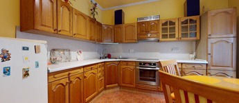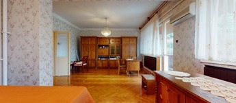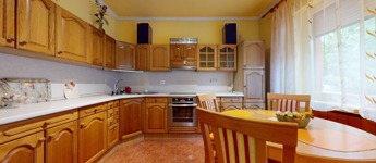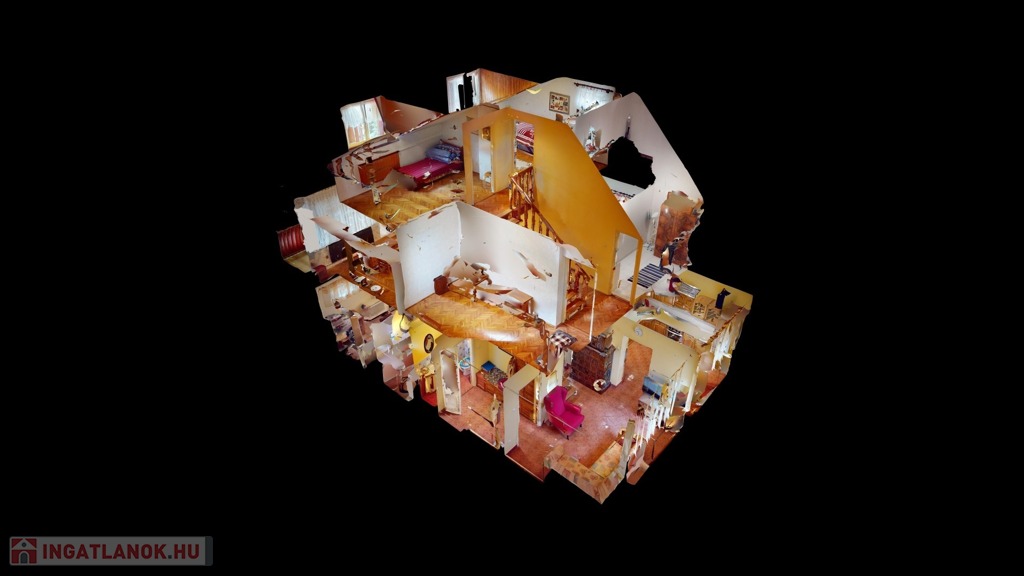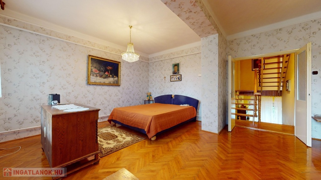 A földszinten valamikor a garázs került megépítésre, itt azonban az évek alatt egy szoba, konyha, fürdőszoba (gyakorlatilag egy különálló lakrész) került kialakításra. Innen pár lépcsőn jutunk a földszintre, amely konyha és étkező helyiségekből áll. Ide egyébként oldalsó fő bejárattal tudunk bejutni, és itt is kialakításra került egy WC, kézmosó.