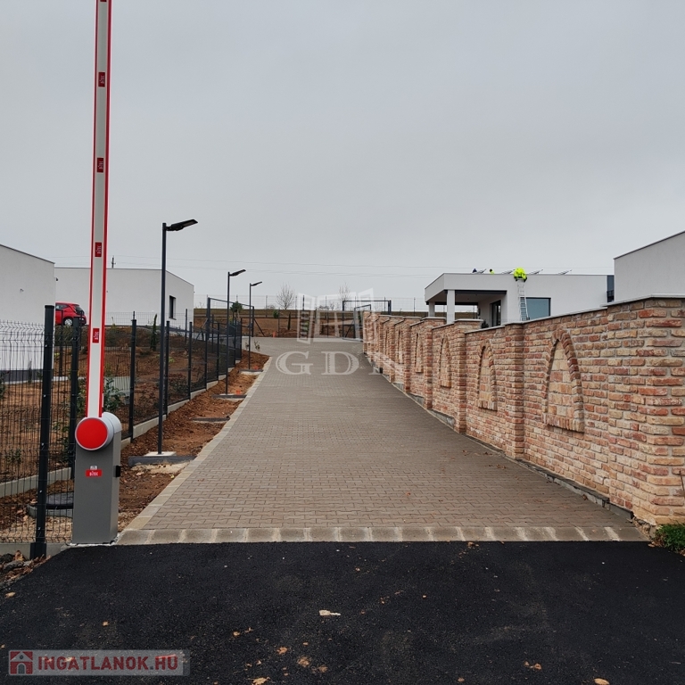 A zárt lakóparkba elektromos sorompón át vezet az út.