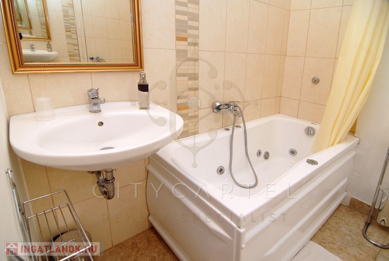 A társalgó pazar hangulatát a kandallóban lobogó tűz, a hűvösebb napokon még barátságosabbá varázsolja. Ezen a szinten van még egy külön bejáratrú szoba fürdőszobával és WC-vel. Az előtérből nyílik még egy mosdó és WC, valamint a 12 négyzetméteres közlekedő oldalánál található lépcső, amely az alsó, kerti szintre vezet továbbá egy 17 négyzetméteres szoba.