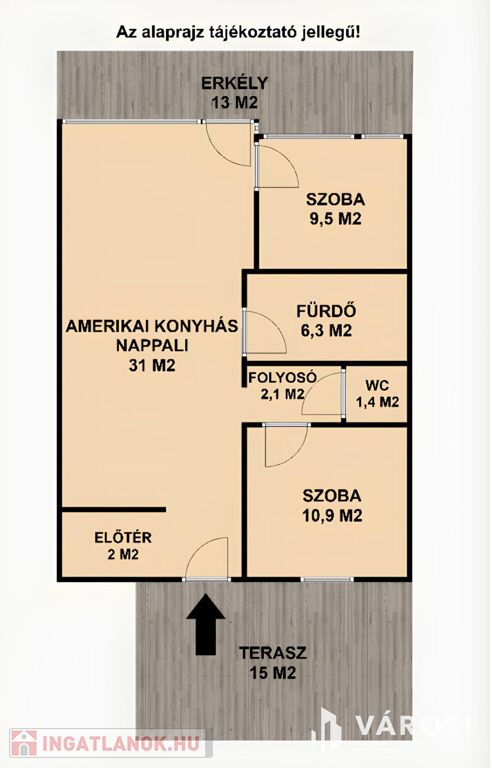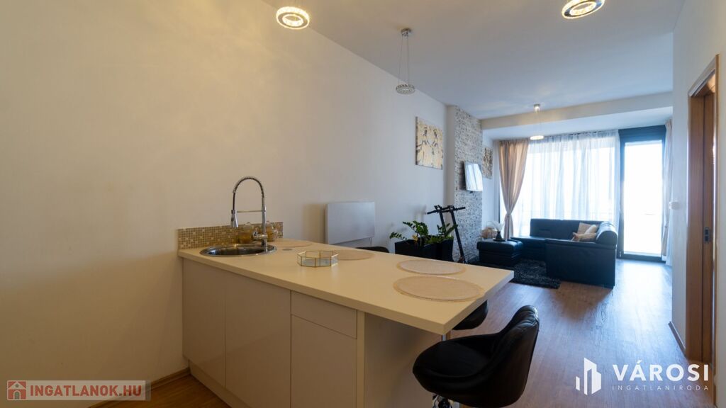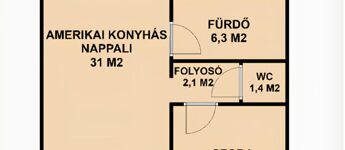 - 64 m2 nettó lakótér, amelynek a központi helysége a tágas 31m2-es amerikai konyhás nappali. Két hálószoba biztosítja a kényelmet, ezen felül helyet kapott egy fürdőszoba wc-vel, valamint egy különálló mellékhelyiség a maximális komfort érdekében.