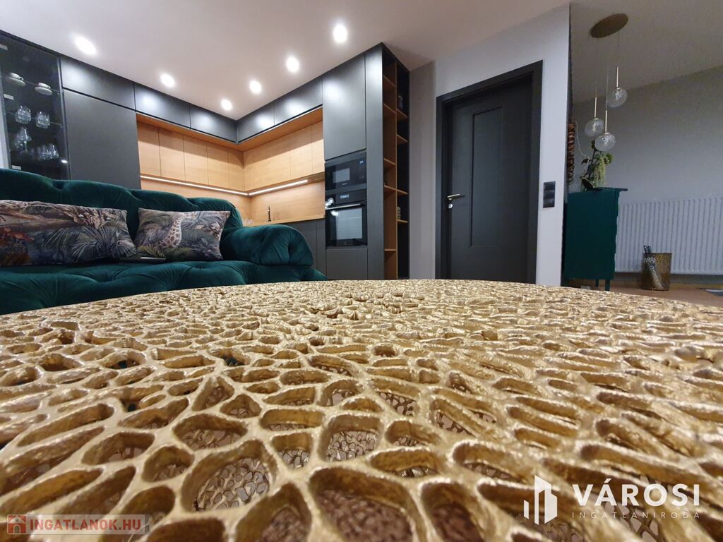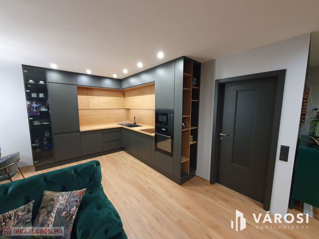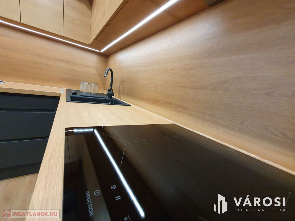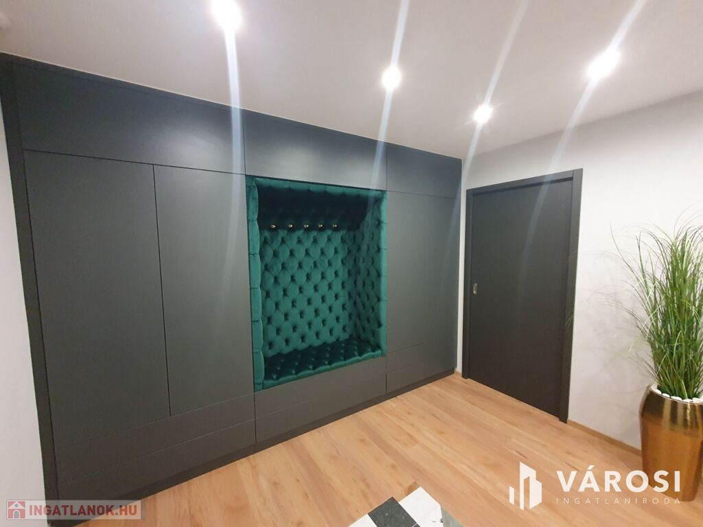 A folyosón és a szobákban magas kopásálló laminált padló és spanyol design járólap található. Beltéri ajtók fényezett egyedi MDF ajtók. A konyhai részen egyedileg gyártott modern, fényezett antracit konyhabútor, nyomógombos beépített szekrények teljesítenek szolgálatot. A konyha felszereltsége: A++ Hűtőszekrény, fagyasztó, sütő, főzőlap, pára elszívó, mosó-szárító gép, mosogató gép. Blanco gránit mosogató tálca, csaptelep, mosószer adagoló.