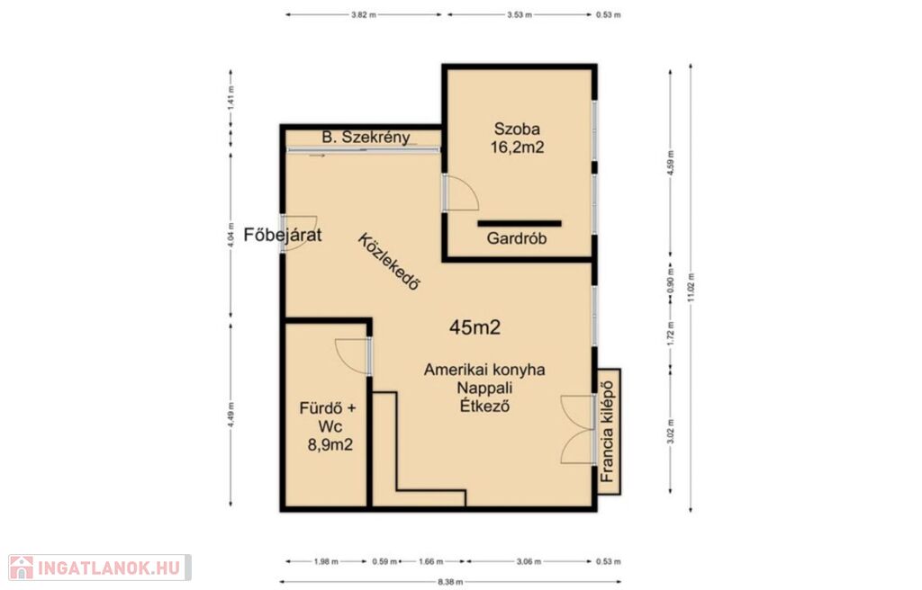 Belső lakrész helyiségei: amerikai konyha + nappali + étkező, fürdőszoba mellékhelységgel együtt, hálószoba gardróbhelységgel, közlekedő-folyosó, erkély.