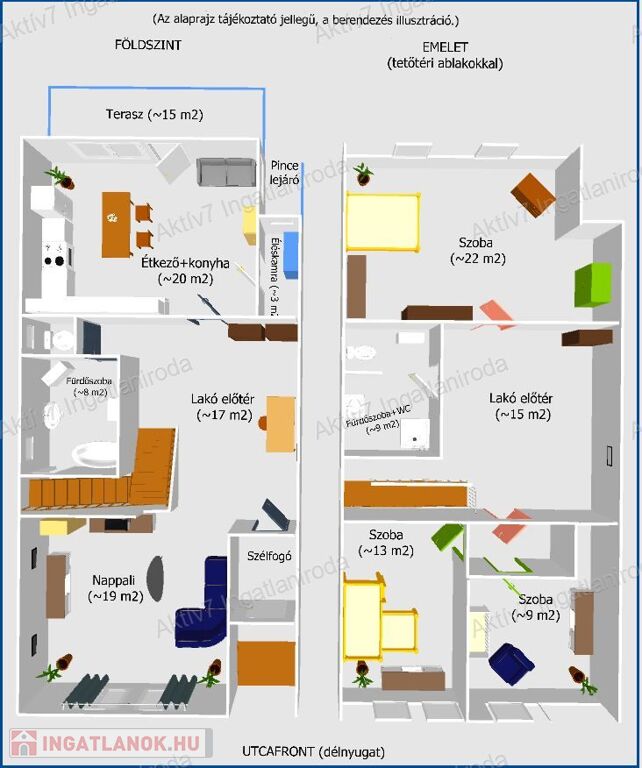 A földszinten előszoba, nappali, konyha, fürdő, és kamra helyiségek találhatóak. Az emeleten, a három hálószoba mellett kialakításra került egy tágas fürdőszoba is.