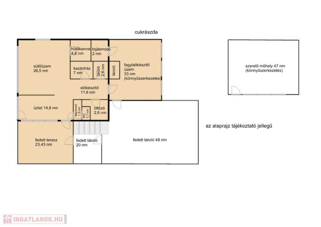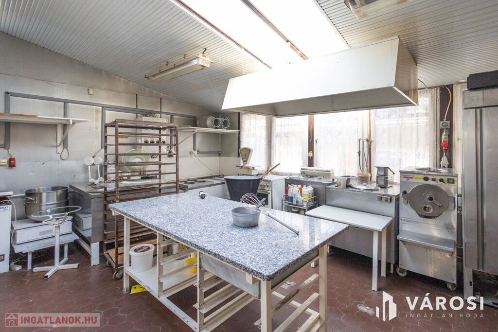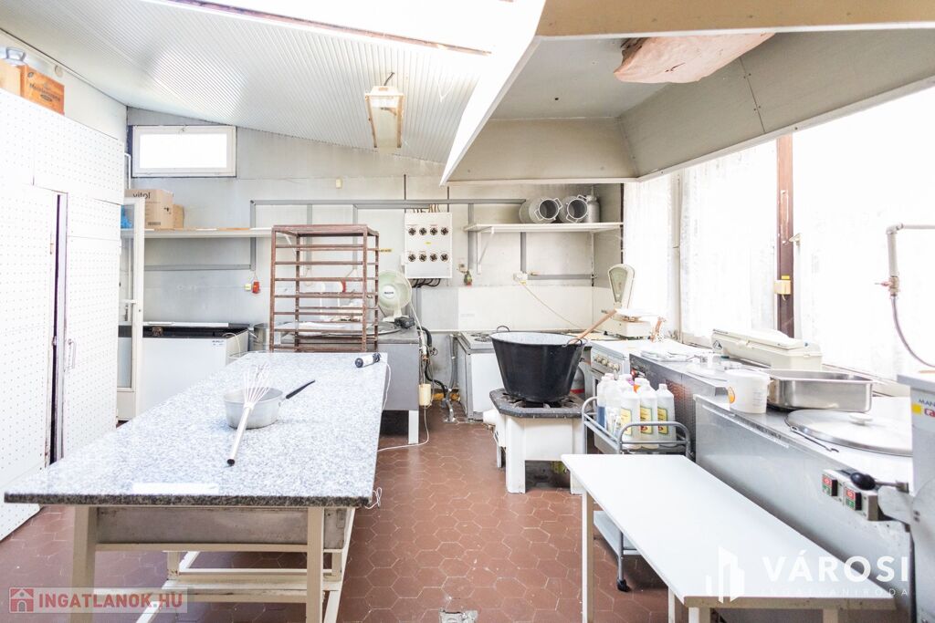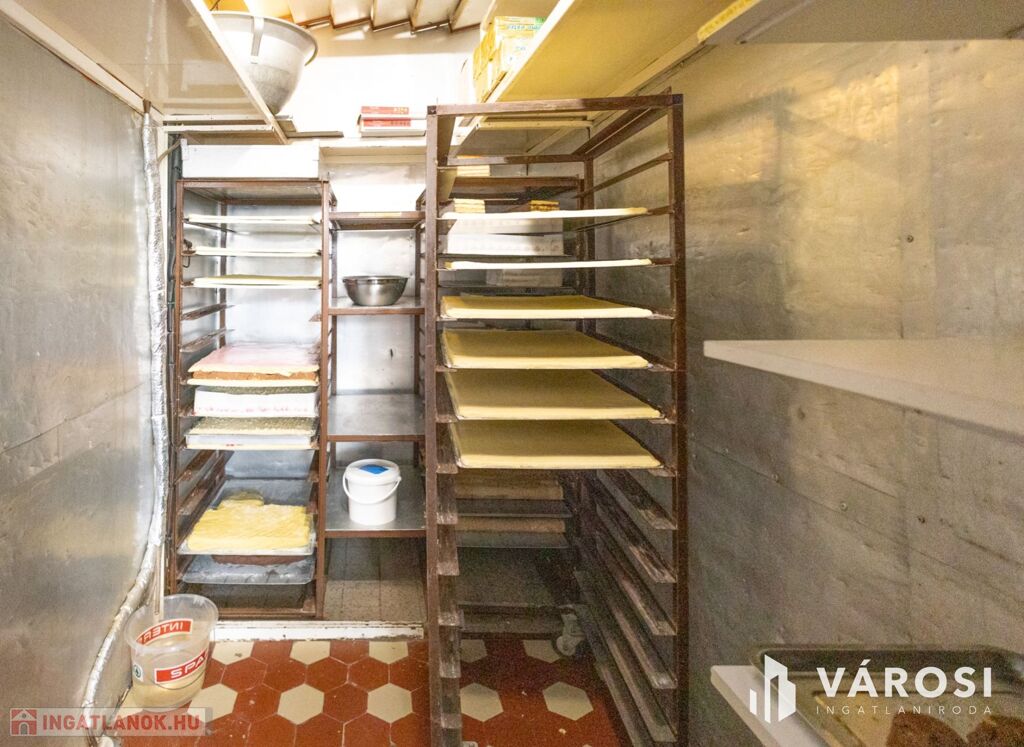 A cukrászda szintén beton lábazatú, tégla falazatú, alapterülete 248 nm, melyben az üzlet mellett, előkészítő és sütő részleg, nagy méretű, hőszigetelt hűtőkamra, tojásmosó és fagylaltkészítő műhely is helyet kapott. A cukrászda mellett fedett terasz és több nagy méretű fedett tároló is helyet kapott. Az épület betonfödémmel rendelkezik, így lehetőség van a tetőtér beépítésére, mely külső lépcsőről megközelíthető, így további cca. 60 nm beépítésére nyílik lehetőség. A cukrászdában 2024-ben lett cserélve a villanyóra, ebben az épületrészben az áramellátás 3x80 A. Emellett a vízmelegítő bojlerek áramellátása külön mérőóráról biztosított, melynek erőssége 3x25 A.