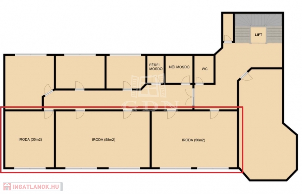 ‣ a helyiségek a lépcsőháztól elzárt folyosón helyezkednek el, emiatt alkalmas privát ügyfélforgalom lebonyolítására is.
