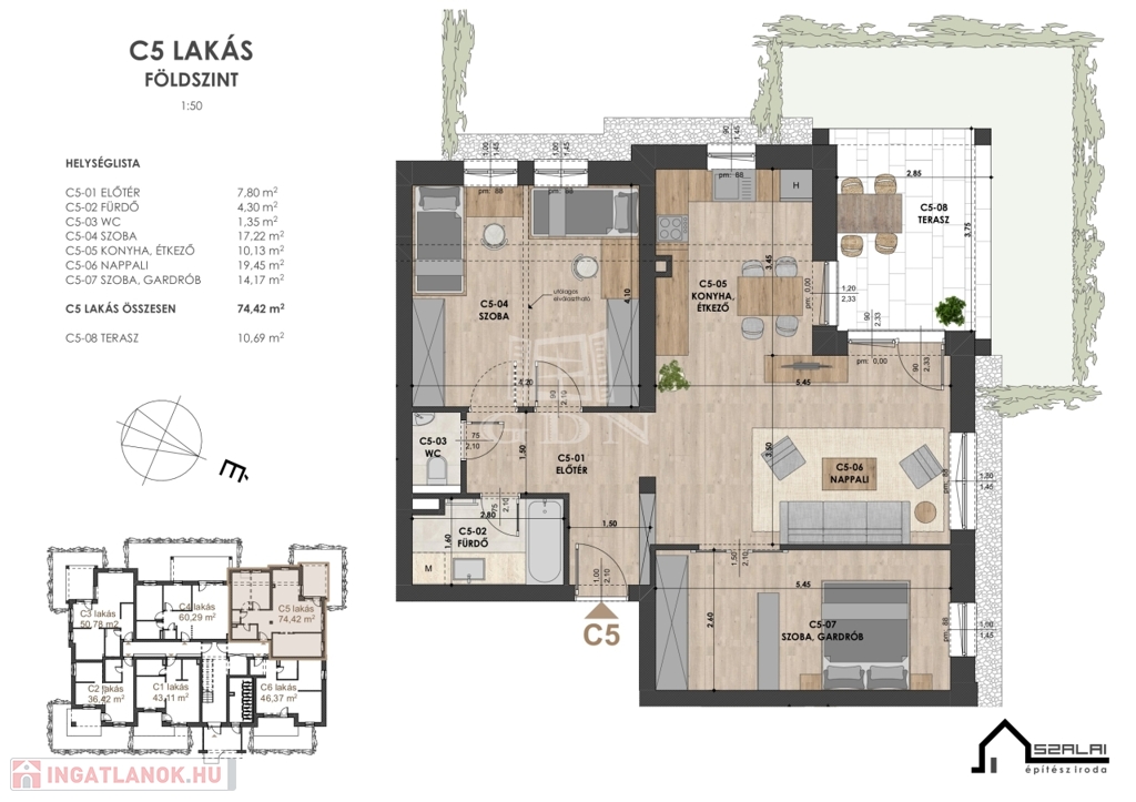 Szombathely kedvelt környékén, a belvároshoz közel, ám még is kellemes családi házas övezetben, még elérhetők új építésű lakások. Ez a projekt a Hunyadi János út-Vitéz utca-Szőllősi sétány által határolt területen kerül megvalósításra három ütemben. Az első két ütem már átadásra került. Teremgarázsban kialakított parkolóhelyeken kívül , felszíni parkolók vásárolhatók az ingatlanokhoz (teremgarázs nettó 7 millió Ft, felszíni parkoló nettó 1.2 millió Ft). A bekerített, sorompóval lezárt terület három gépkocsi ki-behajtóval fog rendelkezni, a Hunyadi és a Vitéz utca felé pozicionálva. Gyalogos sétány biztosítja a kijutást a Szőllősi sétányra. Magas műszaki tartalommal épített lakások melegét házközponti fűtés látja el, lakásonkénti hőmennyiség mérővel, padlófűtéses hőleadással. Ezenkívül hűtő- fűtő klíma biztosítja a kellemes hőmérsékletet az ingatlanokban. Az itt épülő lakások 57-88 m2 -es 3-4 szobás kialakításúak. Minden igényt kielégítő felszereltségű erkélyes, teraszos ingatlanok alkalmasak nagy családosoknak, pároknak, befektetőknek egyaránt. Beltéri ajtók, szaniterek, burkolatok választhatók. A lakópark akadálymentesített, a földszinten közös kerékpártároló, valamint szintenként saját tárolók is elérhetők. A hirdetésben szereplő lakás főbb paraméterei: C Fsz.5. A lakás 74 m2, terasza 11 m2.