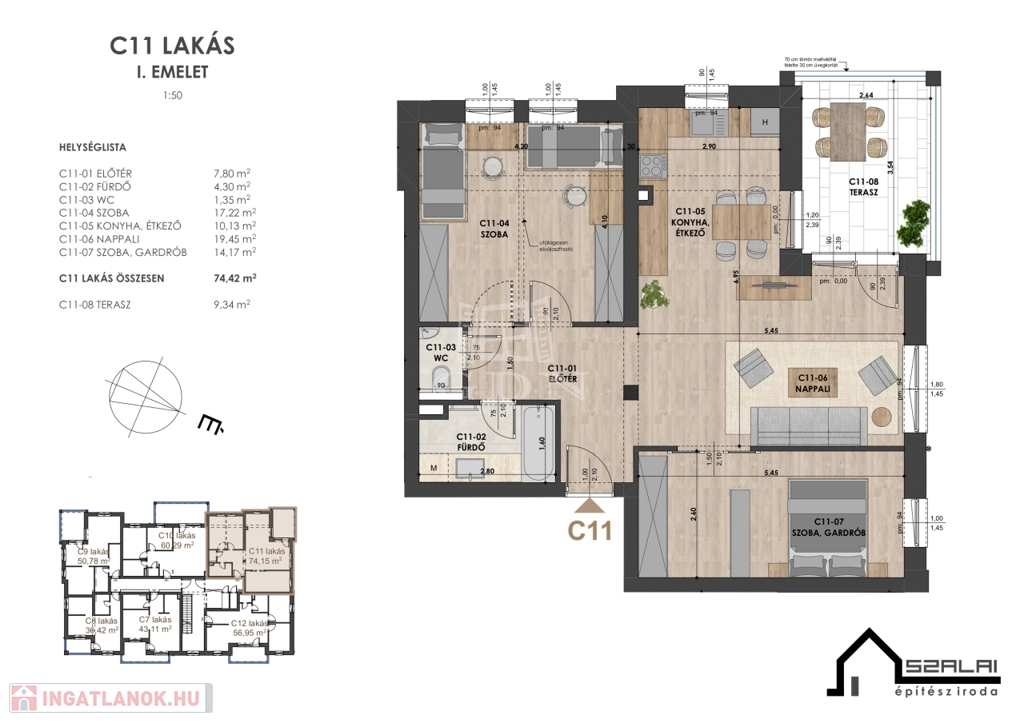 Szombathely kedvelt környékén, a belvároshoz közel, ám még is kellemes családi házas övezetben, még elérhetők új építésű lakások. Ez a projekt a Hunyadi János út-Vitéz utca-Szőllősi sétány által határolt területen kerül megvalósításra három ütemben. Az első két ütem már átadásra került. Teremgarázsban kialakított parkolóhelyeken kívül , felszíni parkolók vásárolhatók az ingatlanokhoz (teremgarázs nettó 7 millió Ft, felszíni parkoló nettó 1.2 millió Ft). A bekerített, sorompóval lezárt terület három gépkocsi ki-behajtóval fog rendelkezni, a Hunyadi és a Vitéz utca felé pozicionálva. Gyalogos sétány biztosítja a kijutást a Szőllősi sétányra. Magas műszaki tartalommal épített lakások melegét házközponti fűtés látja el, lakásonkénti hőmennyiség mérővel, padlófűtéses hőleadással. Ezenkívül hűtő- fűtő klíma biztosítja a kellemes hőmérsékletet az ingatlanokban. Az itt épülő lakások 57-88 m2 -es 3-4 szobás kialakításúak. Minden igényt kielégítő felszereltségű erkélyes, teraszos ingatlanok alkalmasak nagy családosoknak, pároknak, befektetőknek egyaránt. Beltéri ajtók, szaniterek, burkolatok választhatók. A lakópark akadálymentesített, a földszinten közös kerékpártároló, valamint szintenként saját tárolók is elérhetők. A hirdetésben szereplő lakás főbb paraméterei: Első emelet 11. A lakás 74 m2, terasza 9 m2.