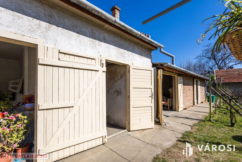 Az ingatlanhoz duplatelek tartozik, melyben egy nagy méretű melléképület is helyet kapott, ebben akár garázsnak, akár műhelynek is jut bőven hely. Az előkertnek köszönhetően a ház nem utcafronton található. A kertben számos virág mellett szőlő, ribizli és málna is helyet kapott.