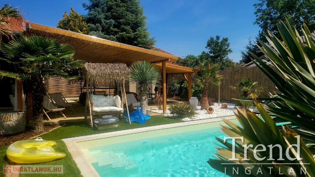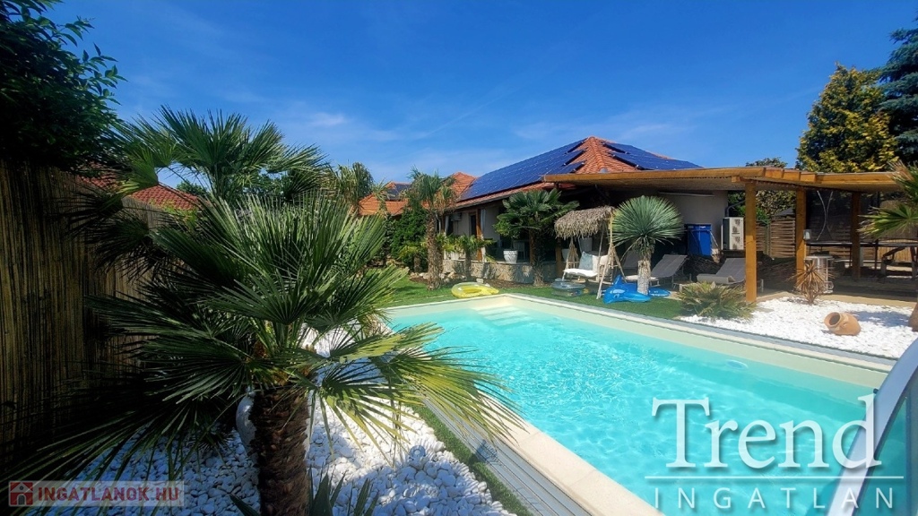 Az udvaron található egy 7x3,5-ös méretű, eltolható tetővel, teljes gépészettel rendelkező fűthető medence is! Az udvar és a kert parkosítása során pálmafákat, egzotikus növényeket ültettek, melyek külső díszburkolatokkal vannak körbe véve. A tetőn 19 kw-os napelemes rendszer található, a ház teljes villamos fogyasztását előállítja, így igen kedvező az ingatlan fenntartási költsége! Az elektromos kapuval ellátott garázsban kialakításra került egy 11/22 Kw-os elektromos autó töltő is.