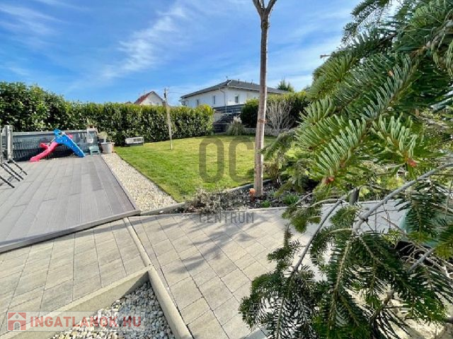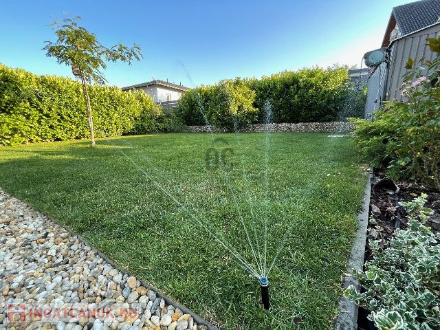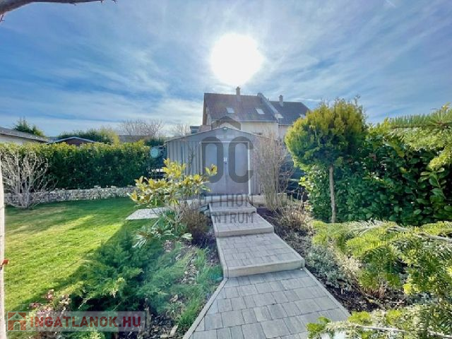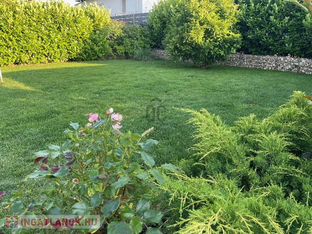 A házhoz tartozó telek összesen 375 nm-es, amely magába foglalja a saját autóbehajtót, ahol 2-3 autó kényelmesen elfér. A nagy gondossággal megtervezett parkosított kertben öntöző rendszer működik. Itt kapott helyet egy 15 nm-es kerti tároló is.