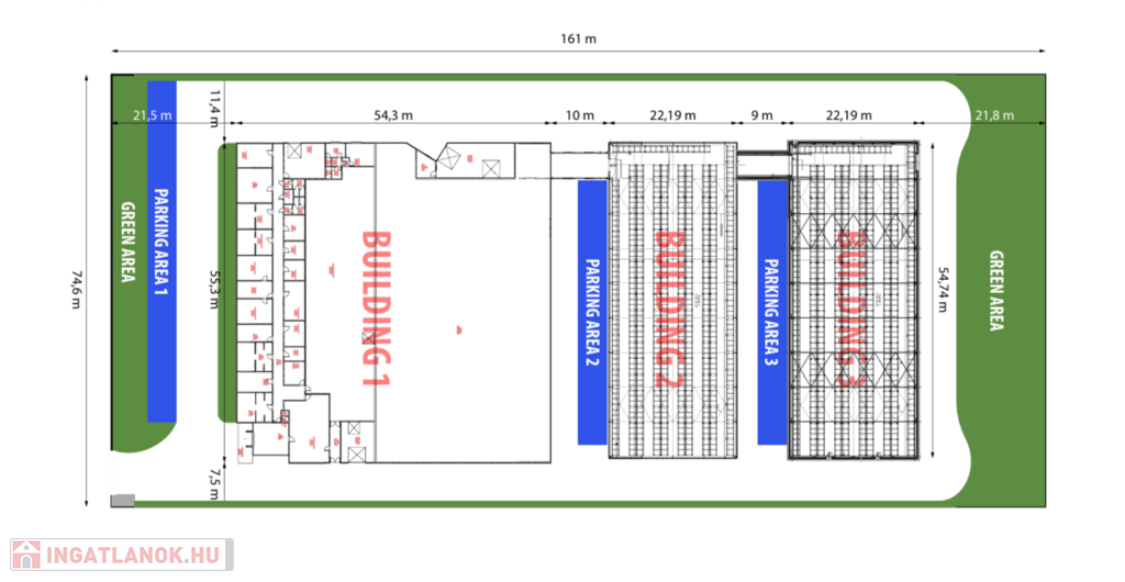 Az épület összesen 6000 nm, melyből 800 nm iroda és bemutatóterem, 5200 nm pedig 3 részből álló csarnokegyüttes, melyből az 1. csarnok 3000 nm, a 2. csarnok 1200 nm, a 3. csarnok pedig szintén 1200 nm. A telephely 12000 nm amely teljesen térkövezett, és körbeöleli az egész komplexumot, teherautóval, kamionnal is körbejárható. A raktárépületek belmagassága közel 8 méter. Kérem a további részletekért keressen telefonon vagy email-ben!