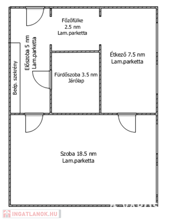 Helyiségei: 1 szoba, konyha, étkező, fürdőszoba, előszoba.