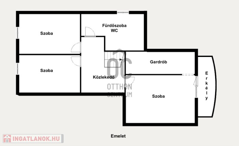 Emelet: 3 hálószoba, előszoba, fürdőszoba + WC, gardrób, erkély