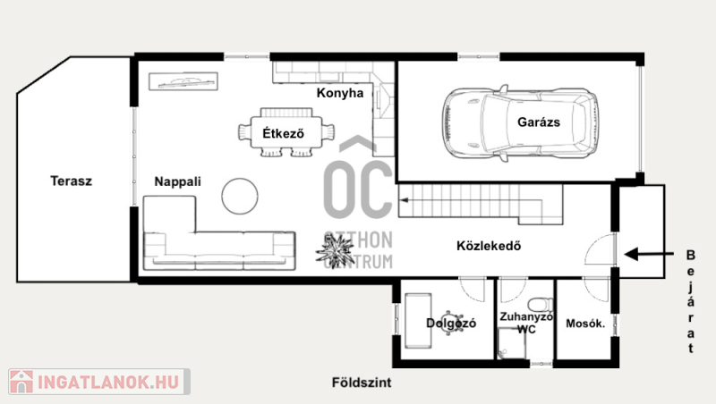 Földszint: nappali + étkező + konyha (36 m²), spájz, dolgozószoba, mosókonyha zuhanyzóval, WC, beépített szekrény, terasz