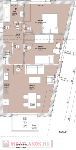 Hasznos alapterület összesen: 61,19m2