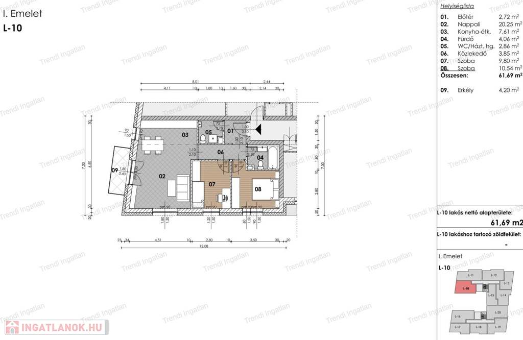 Az 1. emeleten található 61,69 m²-es lakásban amerikai konyhás nappali, 2 szoba, fürdőszoba, háztartási helyiség WC-vel, közlekedő, előtér kerül kialakításra. Nappaliból 4,20 m²-es erkély nyílik.