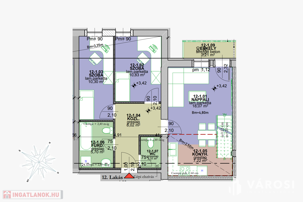 Az emeleten levő 62,45 négyzetméteres 12. lakás a következő helyiségekkel kerül kivitelezésre: nappali, 2 szoba, konyha, fürdőszoba, 8,27 négyzetméteres galéria és egy 3,21 négyzetméteres erkély. Ára: 72 202 200 Ft.