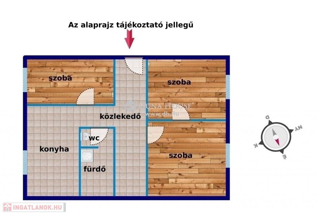 Szobákban parketta, míg a többi helyiségben járólap található.