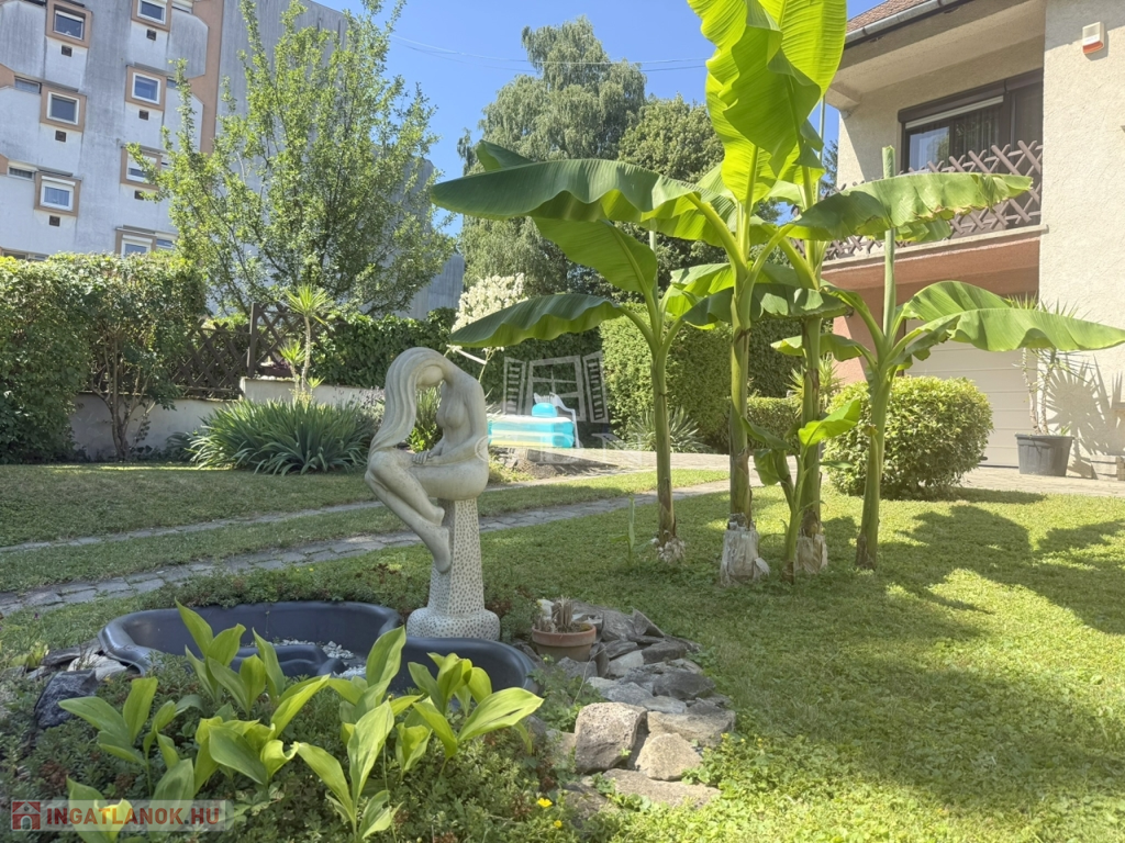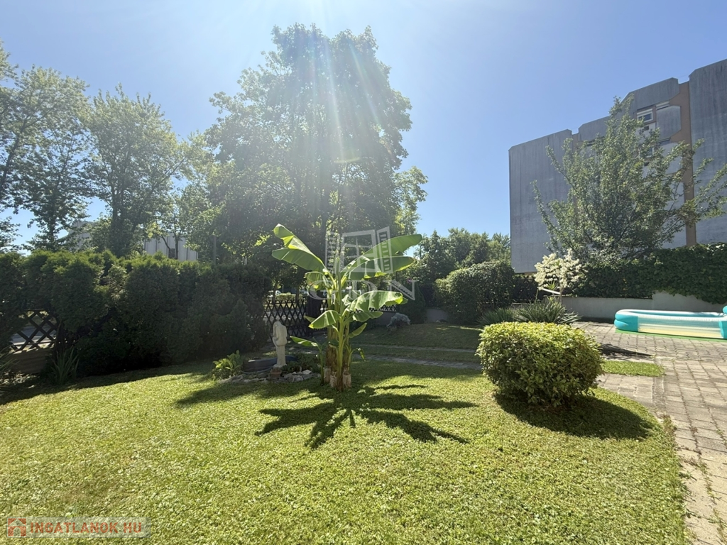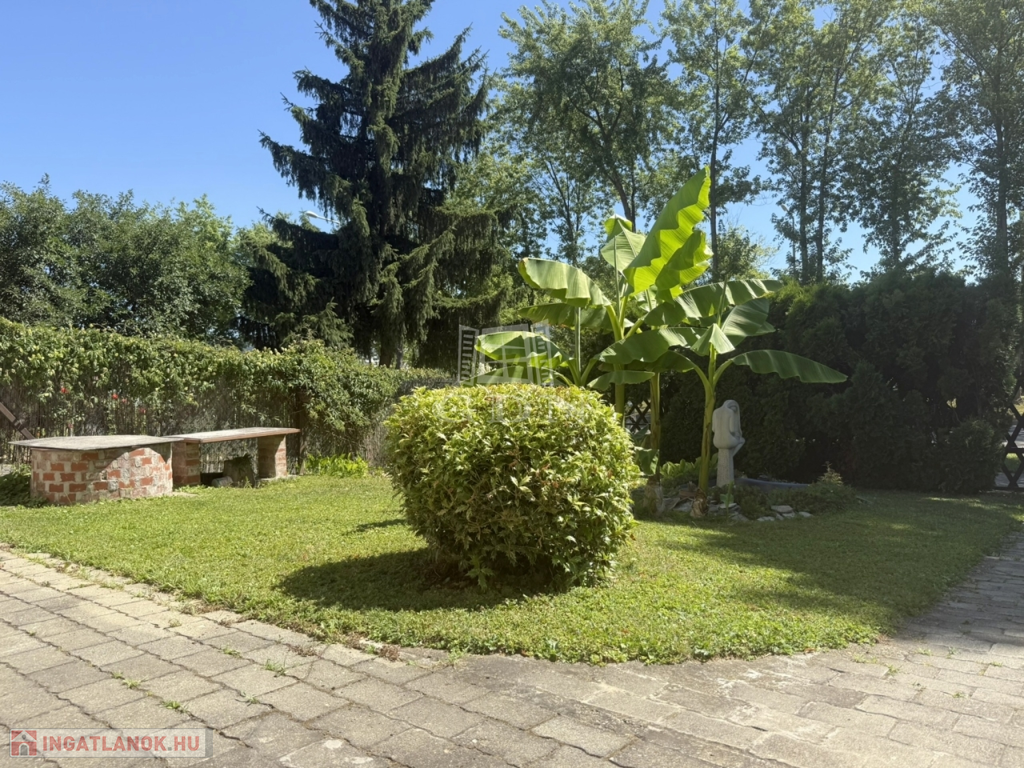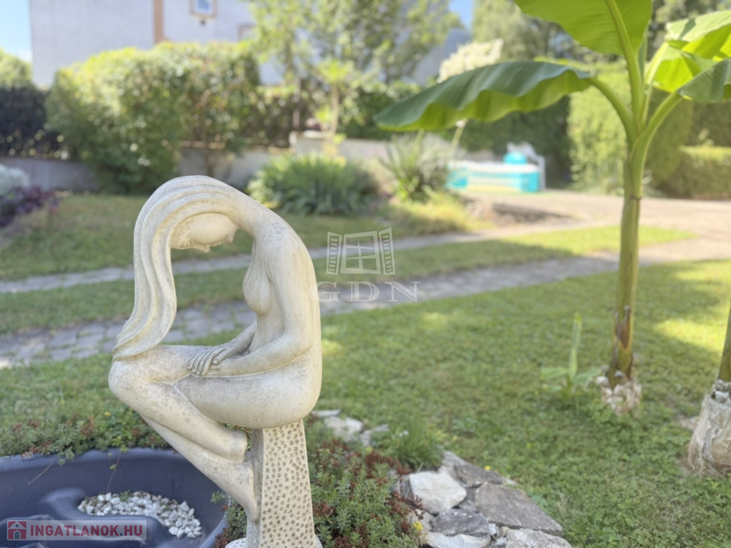 Mérete megfelelő kerti bútorok, játékok, medence ( betonozott rész készült hozzá ) kihelyezésére, azonban nem kell egész napokat fűnyírással tölteni.