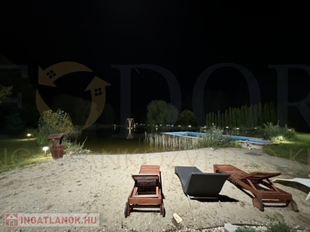 A birtok ékköve az organikus kialakítású, fűthető dísztó, melyből két vízköpő emelkedik ki.