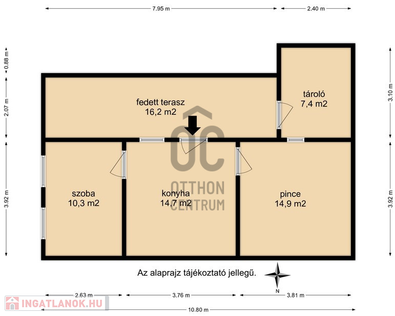 - az egy szintes épület helyiségei: hálószoba, konyha-étkező, borospince, tároló és terasz /16,2 m2/ össz. nettó 47 m2 alapterülettel