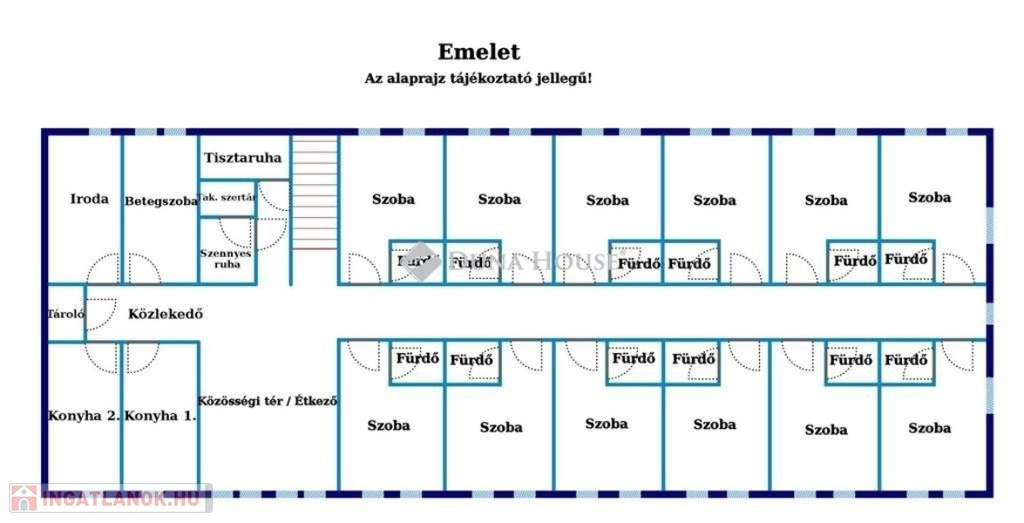 Az épületben 4 konyha, betegszoba, személyzeti pihenő, mosó- és vasalószoba, raktár és tároló helyiségek találhatók.