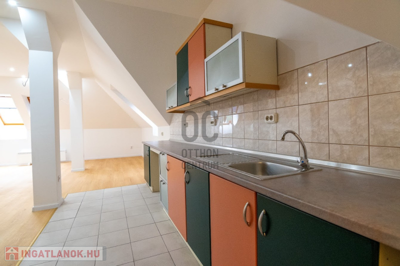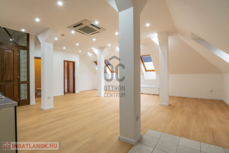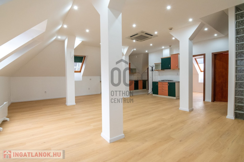 Eladó belvárosi tetőtéri lakás 2. emelet 84 m2 nappali-étkező-konyha 2 háló zárt lépcsőház riasztó, gázos, klimatizált
