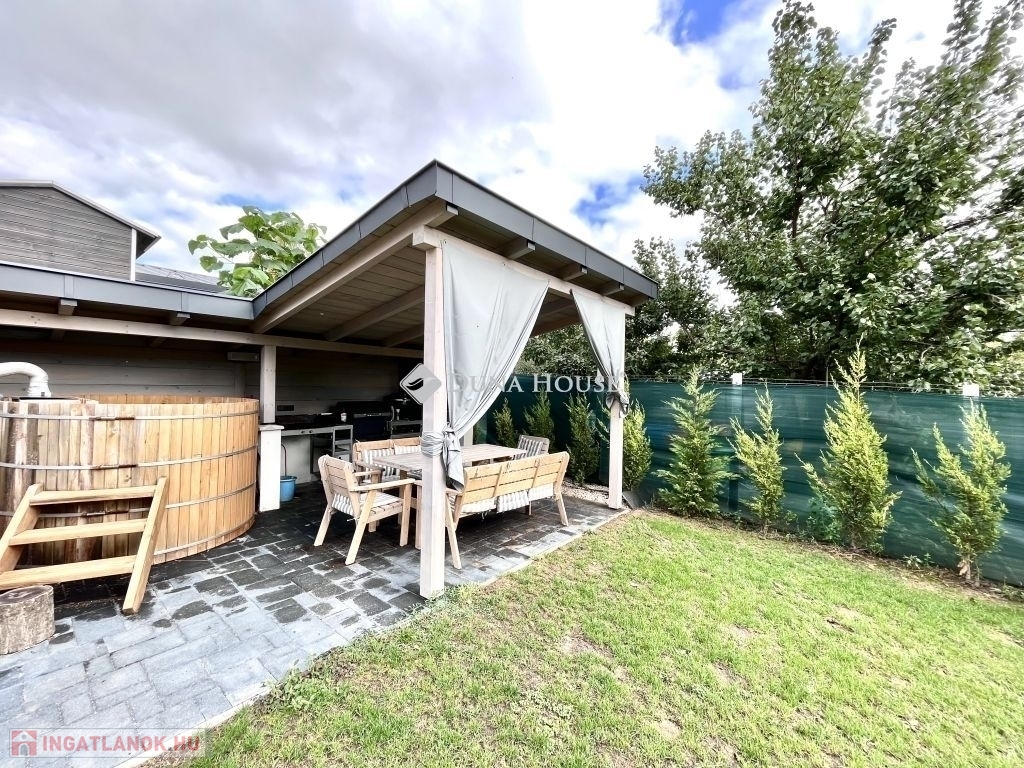 Az udvaron fedett terasz, egy hangulatos filagória MELYBEN kültéri konyha, grillezővel, dézsával.