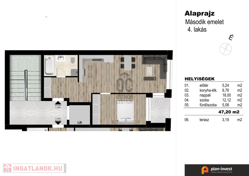 47 m2 alapterületű + 3 m2 erkély tartozik hozzá.