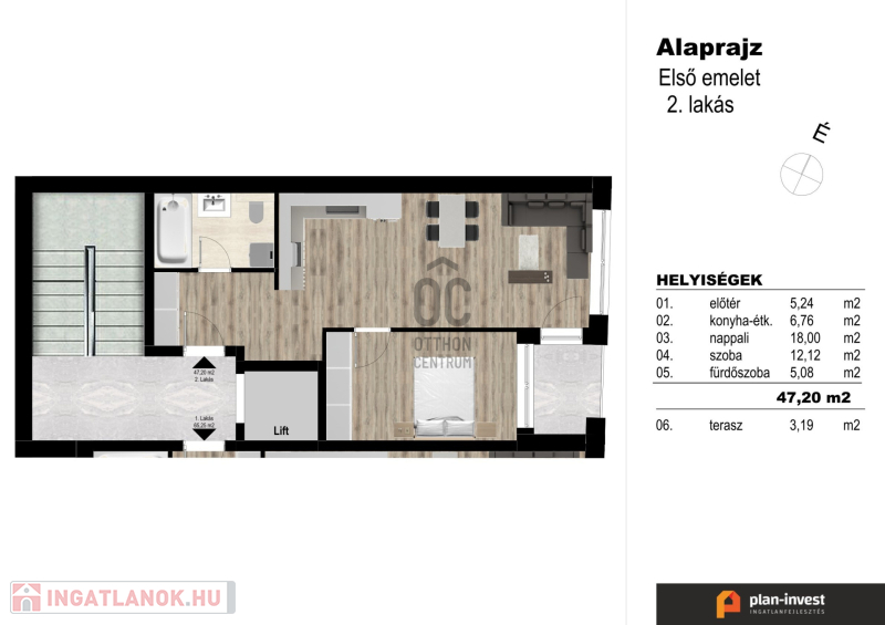 Ez az ingatlan az 1. emeleten található, nettó : 47 m2 + 3 m2 erkély tartozik hozzá.
