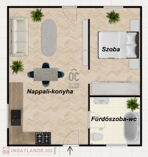 - elosztása: nappali-konyha, fürdőszoba-wc, szoba