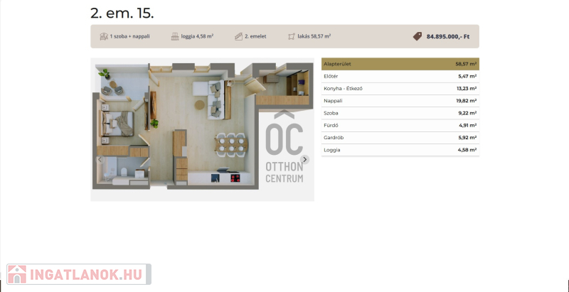 Ez a 2. emeleti lakás 58,57 nm-es, nappali-étkező-konyha +1 szobás, 4,58 nm-es loggiával.