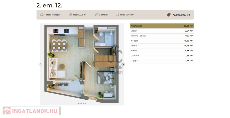 Ez a 2 emeleti lakás 50 nm-es, nappali-étkező-konyha +1 szobás, 4 nm-es loggiával.