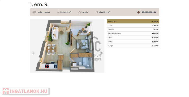 Ez az 1. emeleti lakás 37,19 nm-es, nappali-étkező-konyha +1 szobás, 4,58 nm-es loggiával.