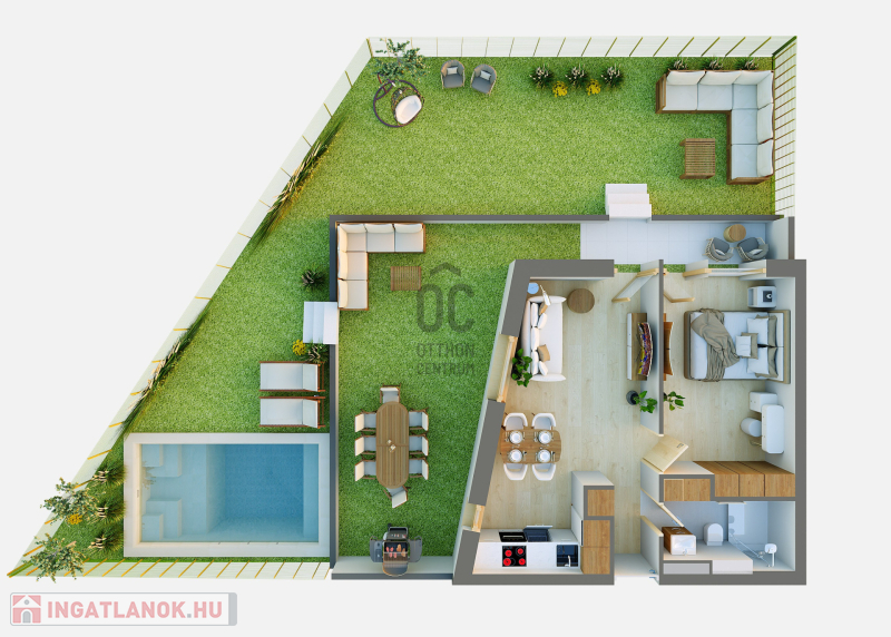 Ez a földszinti kertkapcsolatos lakás 42 nm-es, nappali-étkező-konyha +1 szobás, 5 nm-es terasszal és 148 nm-es kerttel.