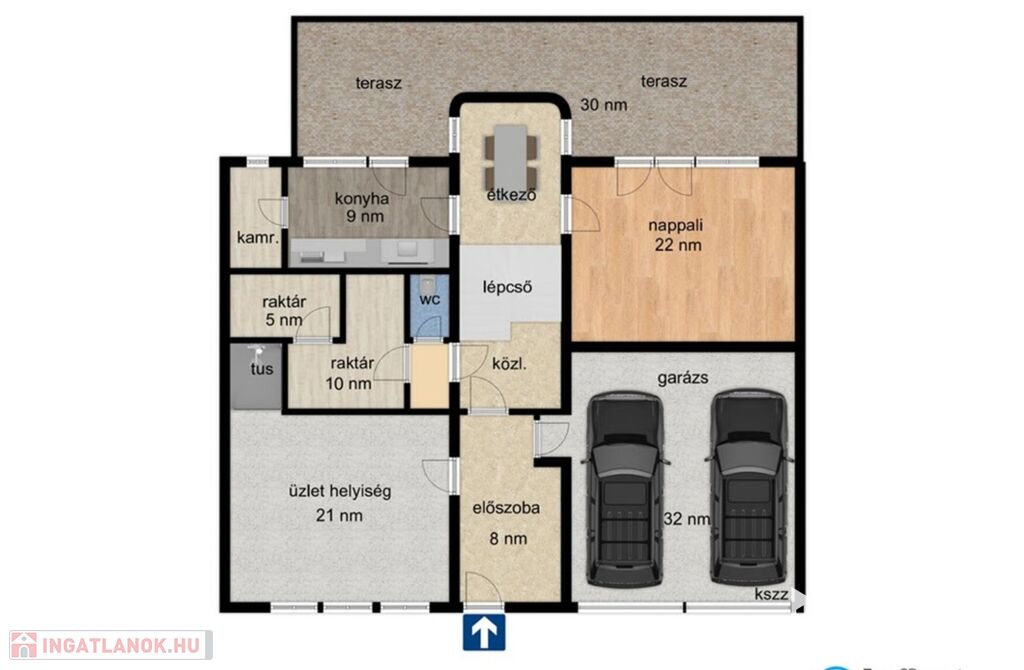 Parkolni a ház aljában lévő, utcafrontról nyíló dupla garázsban (a garázs ára: 15.000.000,-Ft.), valamint a ház előtt lehetséges, nem fizetőövezet.