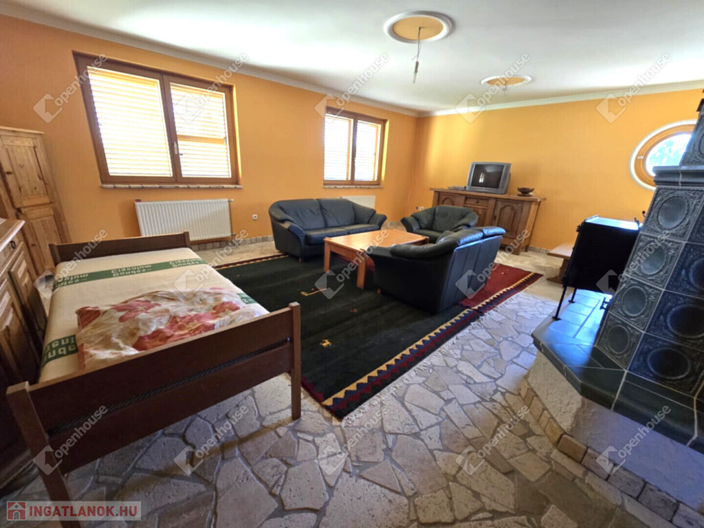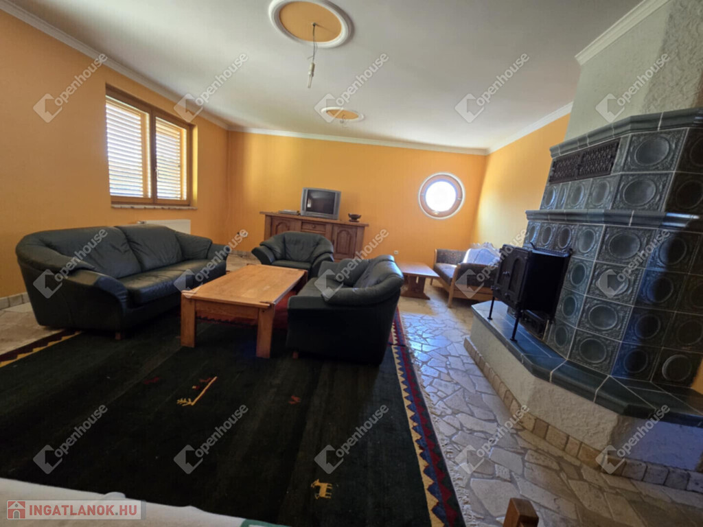 A hangulatról két darab cserépkályha is gondoskodik – egy a földszinten, egy az alsó szinten.