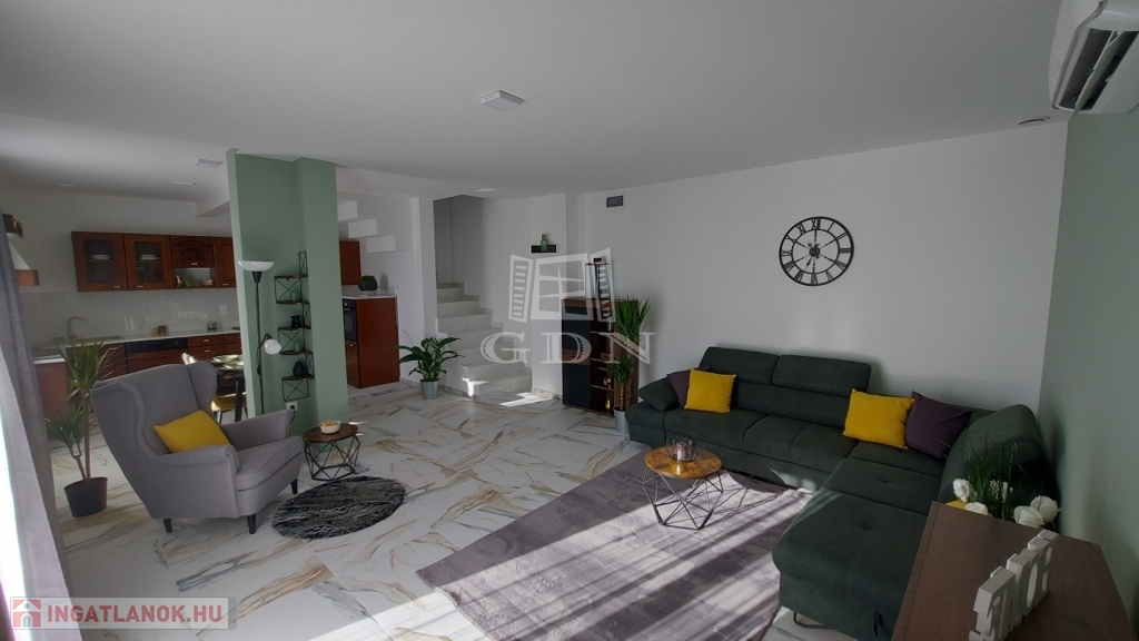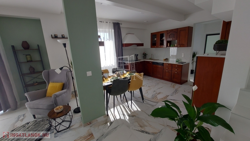 145 m² lakótér + kb. 200 m² saját kert, csendes mellékutcában, pár perc sétára boltoktól, iskolától, tömegközlekedéstől.