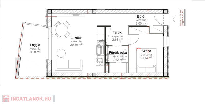 Ez az 3. emeleti lakás 42,39 nm-es, nappali-étkező-konyha +1 szobás, 8,39 nm-es loggiával.