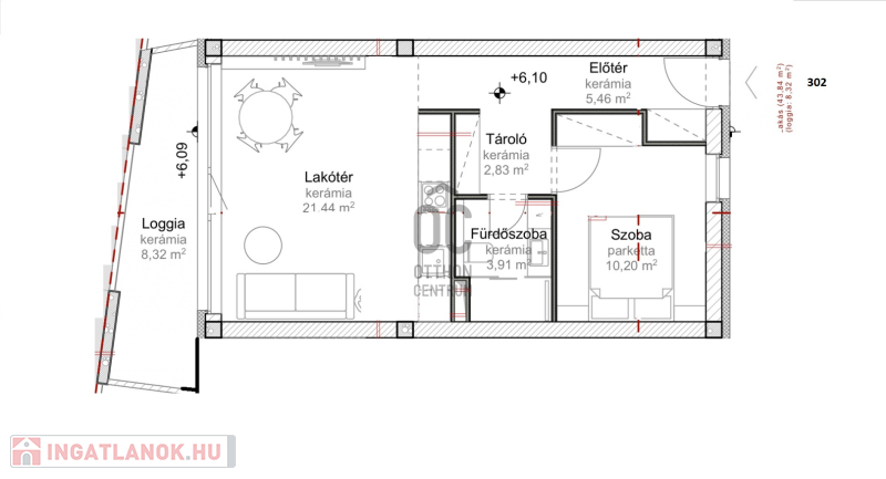 Ez az 3. emeleti lakás 43,84 nm-es, nappali-étkező-konyha +1 szobás, 8,32 nm-es loggiával.