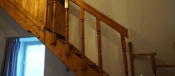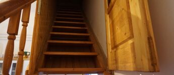 -A kisebbik lakrész 70 m2, tágas szobából, étkező-konyhából, fürdőszobából, WC-ből, előszobából és szélfogóból áll. A lakótér bővíthető a padlástér beépítésével, melyet a tulajdonosok előkészítettek egy az étkezőből induló lépcsősorral és nyílással.