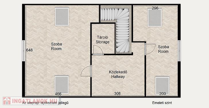 Az emeleti szinten, 2 tágas hálószoba és egy közlekedő került kialakításra. Továbbá található egy jelenleg tárolóként funkcionáló, de fürdőszobának előkészített helyiség is.
