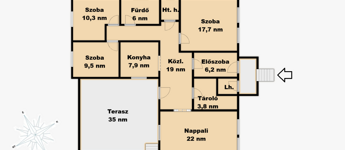 A tágas tetőtérben, további nappali, 3 napfényes szoba, 1 félszoba, konyha, fürdőszoba, wc helyezkedik el, 103 négyzetméteren.