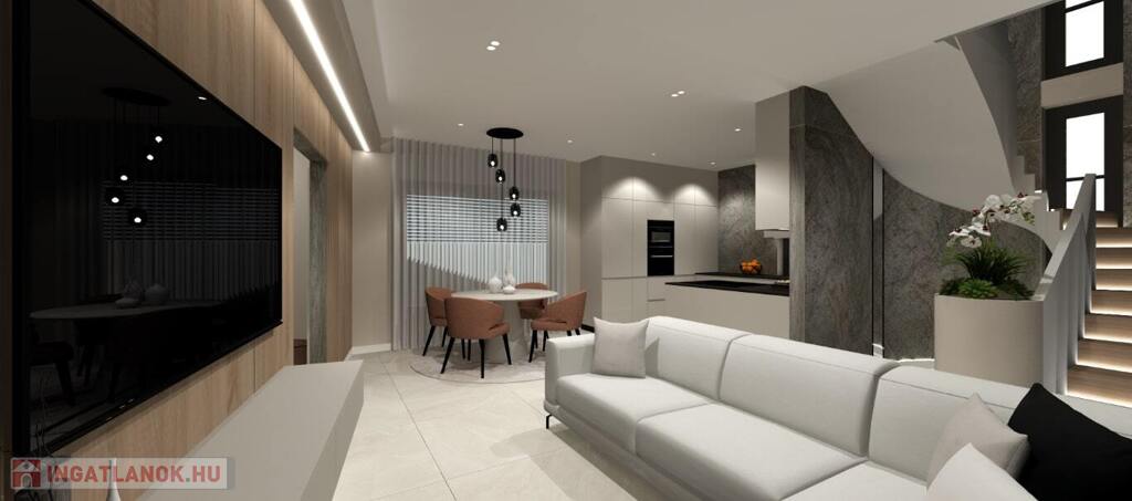 Kaposváron a Kisgát városrészben, a Reményik Sándor utcában, modern környezetben lévő, új építésű, exkluzív - magas minőségben kivitelezett, korszerű építőanyagokból épülő 4 lakásos Villaparkban - 125 m2-es kétszintes családi ház eladó. A lakóház földszintjén (76,8 m2) előszoba, nagy üvegportállal rendelkező tágas nappali - étkező, konyha, 1 szoba, gardrób, fürdőszoba-wc, további wc, gépészeti - tároló helyiségek kerültek kialakításra, továbbá tartozik hozzá egy 20,70 m2-es fedett, belső udvar felé néző terasz is - süllyesztett jakuzzival. Az épület felső szintjén (48,20 m2) előszoba, 2 szoba, fürdőszoba-wc és háztartási helyiségek, illetve 20,77 m2-es nyitott terasz vannak. A korszerű, modern energetikájú - alacsony rezsivel rendelkező - épület villany ellátása H tarifával megoldott, a fűtése LG típusú hőszivattyúval kerül kivitelezésre, továbbá fan-coil rendszer biztosítja a helyiségek fűtését és hűtését. Távirányítással működő zsaluziák lesznek felszerelve, illetve prémium minőségű szaniterek és szerelvények, illetve csapok - Wellis, illetve HansGrohe - kerülnek beépítésre. Az igényesen kialakított udvaron tartozik a lakáshoz 1 db fedett gépkocsibeálló és további 1 db kocsibeálló. Az épület teljes kivitelezését - és várható 2026. III. negyedévben történő átadását - követően a - komoly referenciákkal rendelkező - beruházó végzi majd a Villapark közös költséggel járó üzemeltetését is. A lakáshoz tartozó önálló udvar mérete: 75,55 m2