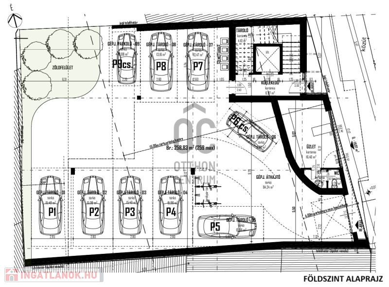 Földszinten 1 db üzlethelyiség és fedett/nyitott gépjárműtárolók (8MFt + ÁFA), melyek megvásárlása nem szükségszerű!