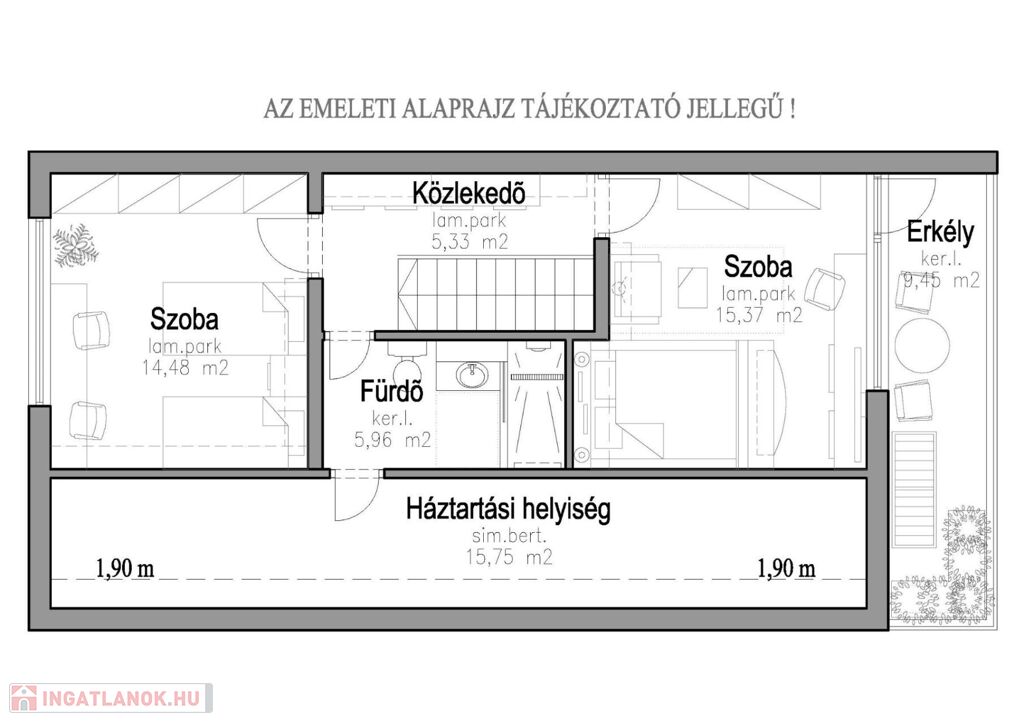 -Emeleti szobák: ~15,00 m2, ~15,00 m2