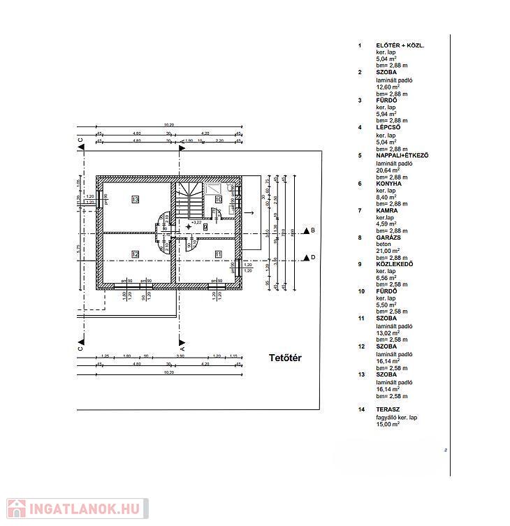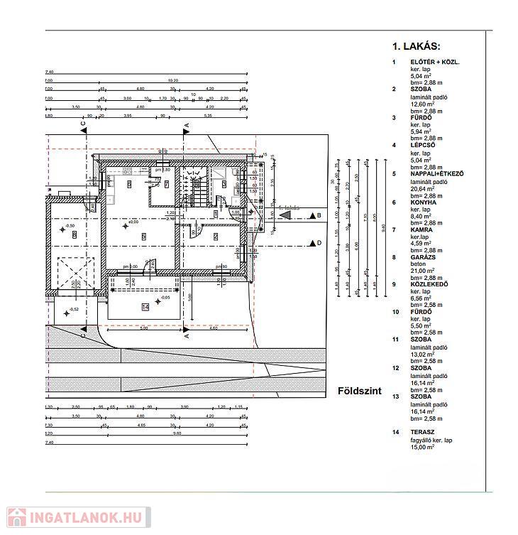 Földszint: amerikai konyhás nappali, 1 szoba, zuhanyzós fürdőszoba + mellékhelyiség, kamra, tároló, közlekedő, kertkapcsolatos terasz