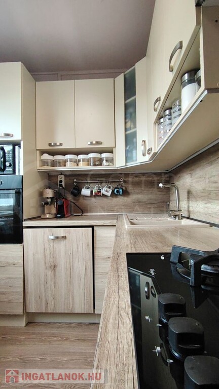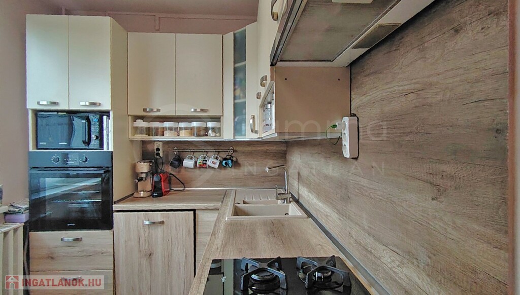 A konyha beépített háztartási gépekkel (sütő, főzőlap, páraelszívó) felszerelt, melyek a vételár részét képezik.