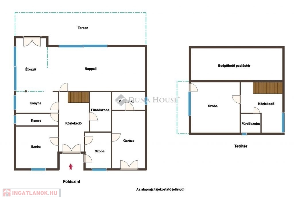 Földszint (110 m²):- 2 különálló hálószoba;- tágas nappali hangulatos kandallóval;- étkezős konyha;- kamra;- fürdőszoba;- közlekedő;- nagy méretű, nyitott terasz