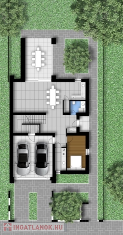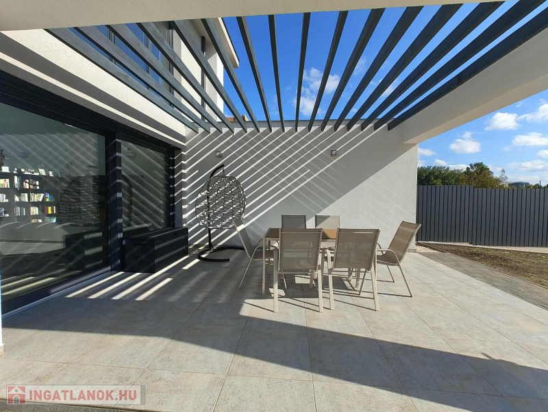 Kert: A házhoz (tervezett zöldfelület) 553,61 m2 kert tartozik, amelyben automata öntözőrendszer került előkészítésre. A nappalit a kerttel nagy méretű, déli fekvésű terasz kapcsolja össze.